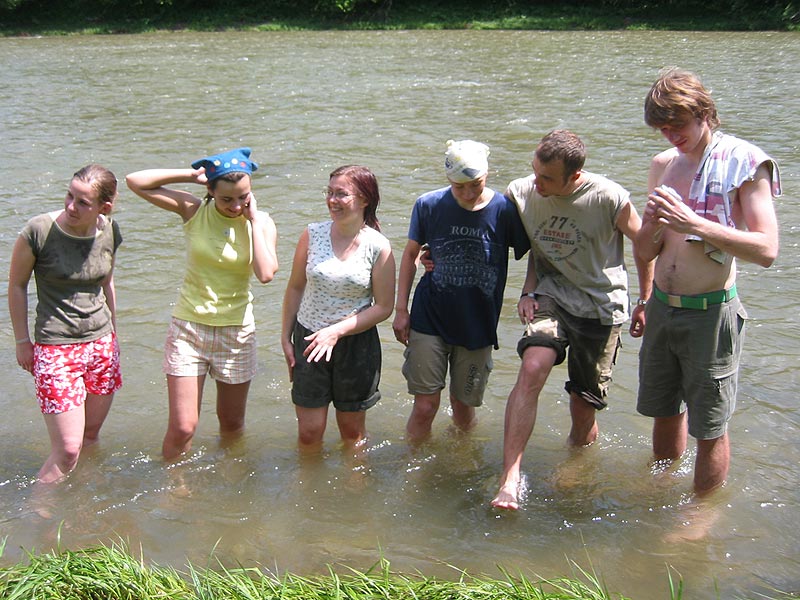 Przejście San w bród było nielada wyzwaniem! Parę osób co prawda „poległo” (m. in. nasza doświadczona Ania Z. oraz Sylwia z SGH, nie mogły oprzeć się pokusie by się wykąpać w pełnym rynsztunku), ale przygoda zapewne pozostanie im w głowach do końca życia. Agat(k)a, aby tradycji stało się zadość, straciła na rajdzie swoje klapki. Właśnie tu puściła jednego Sanem dla potomnych, a potem uroczyście wrzuciła tam drugiego. A co! Niech ten pierwszy nie będzie samotny!! hehe