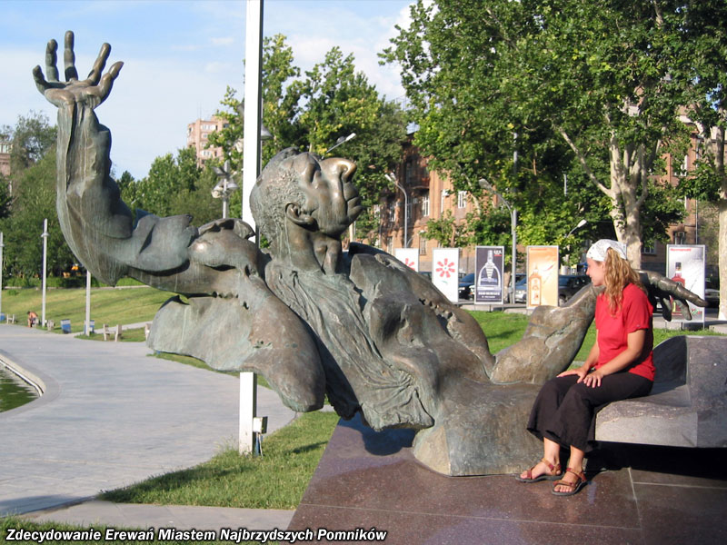 Ochrzciliśmy Erewań miastem najbrzydszych pomników. Wysoko nad miastem góruje paskudna, ale olbrzymia Matka Ormianka, z wyciągniętym w kierunku granicy z Turcją mieczem. W postumencie pomnika znajduje się Muzeum Wojska, niestety podczas naszej wizyty było zamknięte. Do pomnika można się dostać od Opery Kaskadą, czyli swego rodzaju parkiem-schodami, które kończą się 200 metrów wyżej, na tarasie widokowym z fenomenalnym widokiem na całe miasto i Ararat. W okolicy Kaskady można znaleźć pomnik Żołnierzy Ormian, czarne szkaradztwo, mające wyobrażać nagiego żołnierza, w hełmie, z wielkim tyłkiem. Dzieło sztuki jest tak ohydne, że nie zdziwiłbym się, gdyby okazało się, że artysta został powieszony za obrazę stanu. W ścisłym centrum miasta nie ma żadnych monumentalnych zabytków do oglądania, można co najwyżej zrobić wycieczkę do siedziby Radia Erewań. W okolicy opery wyrosła za to masa kawiarni, barów i pubów.