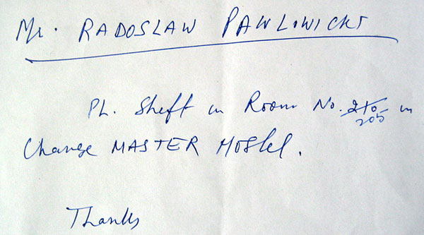 Ponieważ moje dalsze przebywanie w dotychczasowym akademiku w zasadzie nikomu by nie przeszkadzało, twardo walczę o swoje. Dzisiaj straciłem na to prawie trzy godziny. I stoję na straconej pozycji. Dlaczego? Po pierwsze, w Indiach jest bardzo niegrzecznie zadawać pytanie „dlaczego”? A zadałem je dzisiaj przynajmniej dziesięć razy. Po drugie, w Indiach bardzo niegrzecznie jest grozić spotkaniem z przełożonym (co dzisiaj zrobiłem). Po trzecie, w Indiach urzędas trzyma się twardo swoich wytycznych, i nie ma w zwyczaju zastanawiać się nad absurdem swoich decyzji. I nie ma zwyczaju ich zmieniać, nawet jeśli a) jest to w jego mocy; b) nikt by na tym nie stracił, a nawet ktoś zyskał; c) jego przełożonych naprawdę nic nie obchodzi, gdzie mieszka student o identyfikatorze MP629. Po czwarte, bo pan Chowdhary jest kretynem naprawdę ciężkiego kalibru.